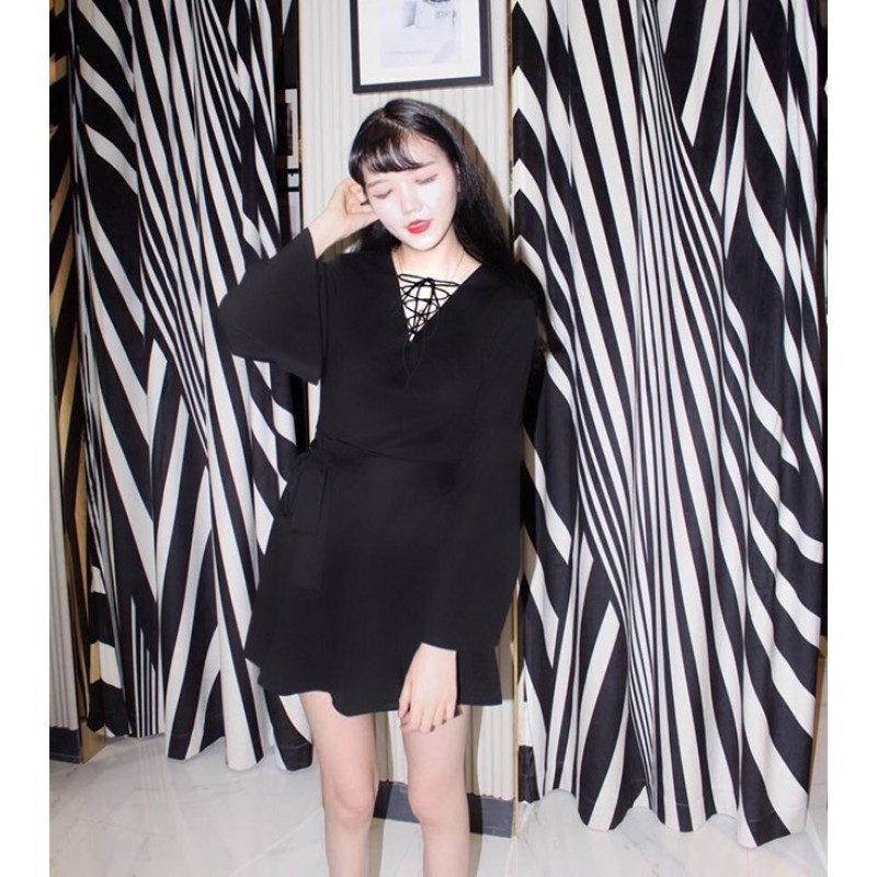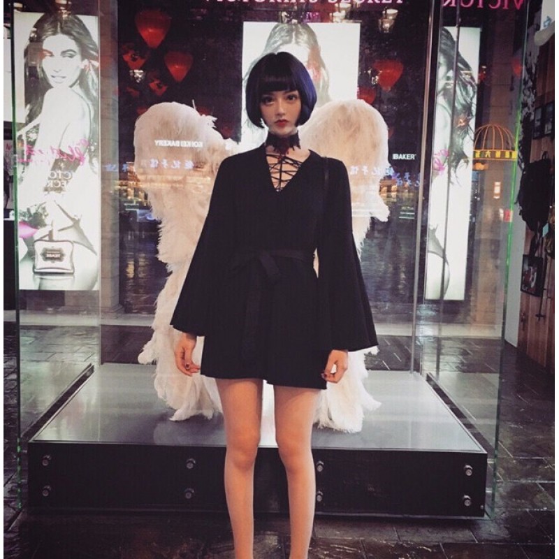 Harajuku V-Neck Bandage Sexy Black Dress Ladies Korean Girl Pagoda Sleeve Long Sleeve Bandage Punk Dress