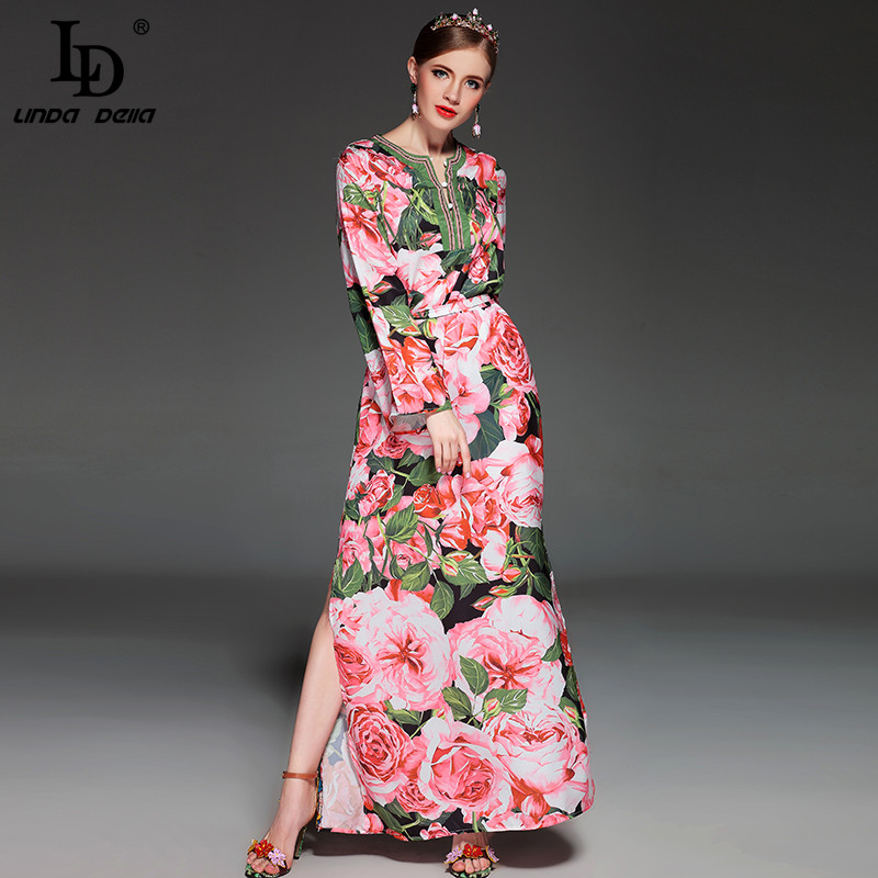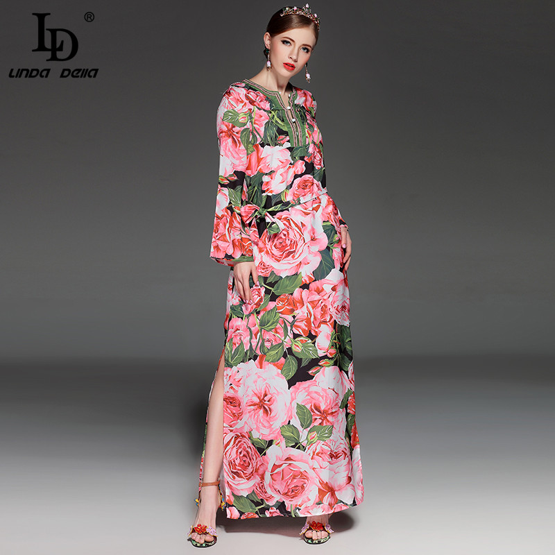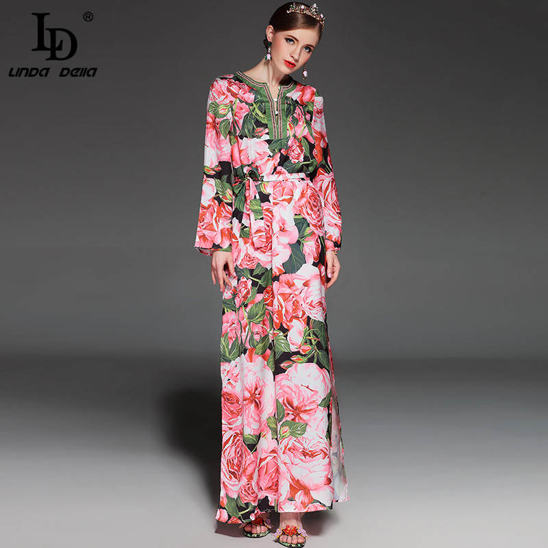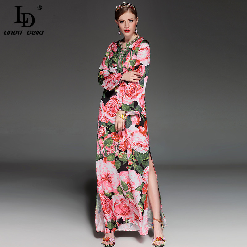 High Quality 2017 Runway Summer Maxi Dress Women's elegant Beading Long Sleeve Beach Boho Charming Rose Floral Print Long Dress