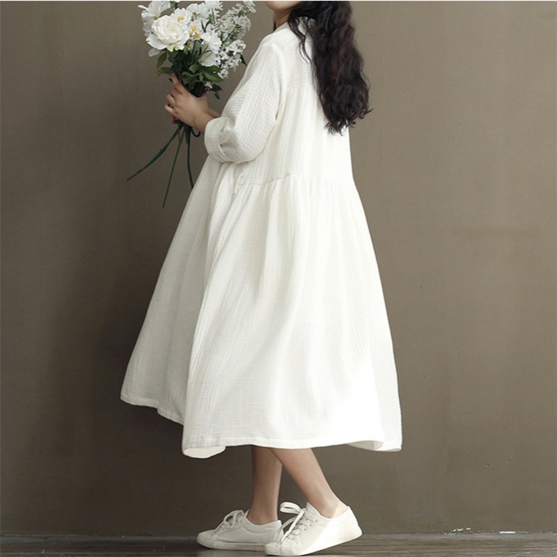 Cotton Linen White Color Women Dress 2017 Spring New Long Sleeve Stand Neck Loose Plus Size Bat Sleeve Irregular Dress