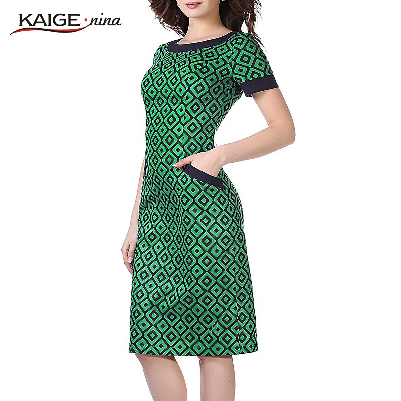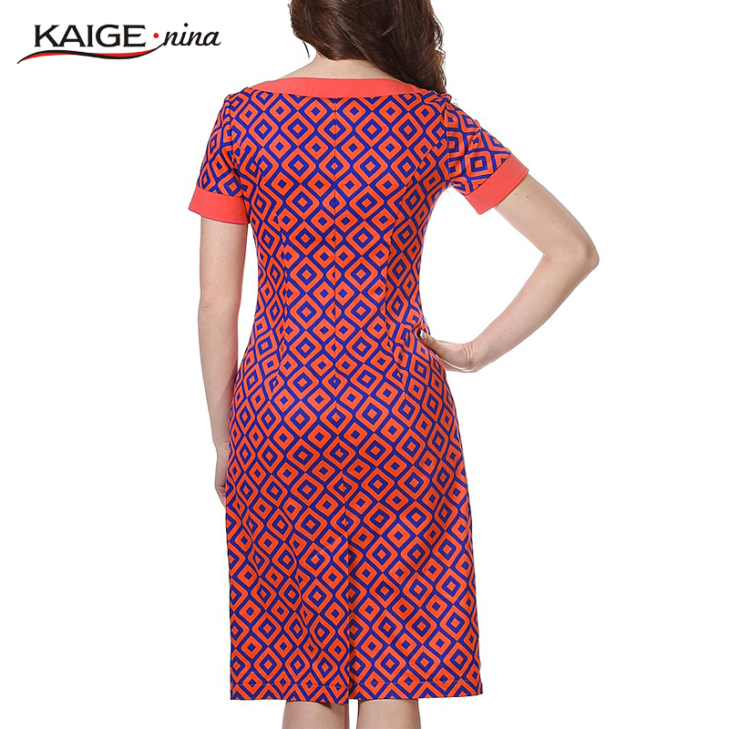 Kaige.Nina New Women's Fashion Short-sleeved Grid Style Without Decoration Round Collar Straight Knee Summer Dress 9109