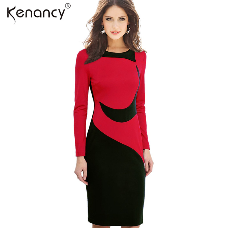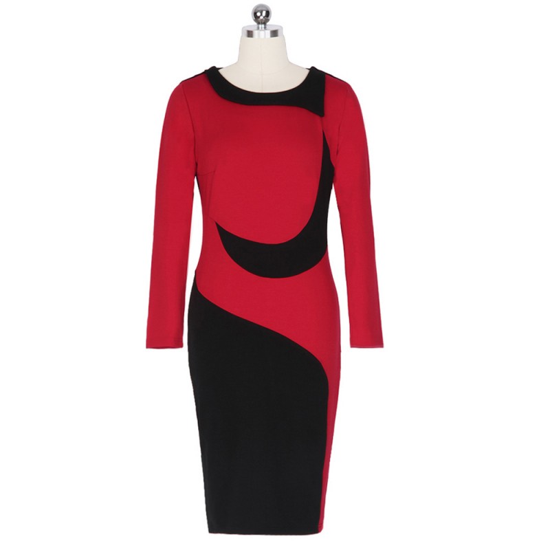 Kenancy Clearance 3XL Plus Size 2 Colors Hit Color Stitching Office Dress Women Long Sleeve Knee-Length Pencil Bodycon Vestidos