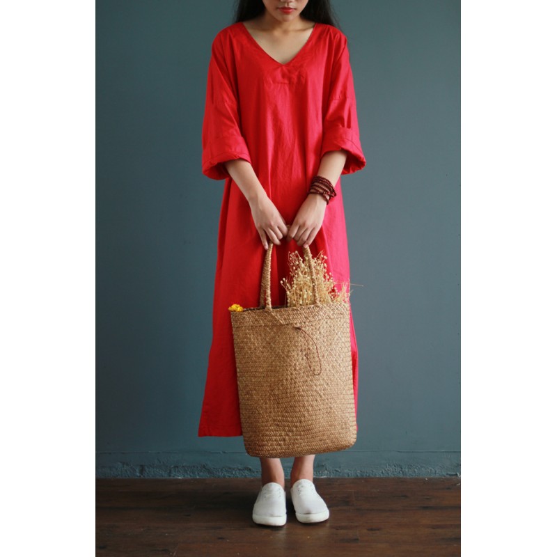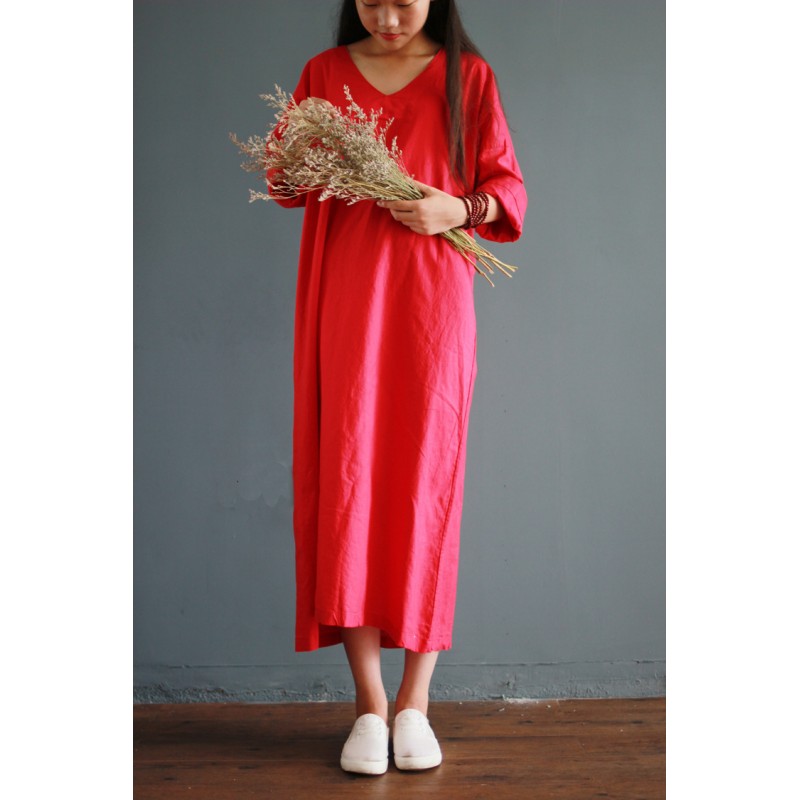 V-collar cotton linen long gown New 2016 autumn half-sleeve loose waist casual dresses for female Vintage dresses white,red