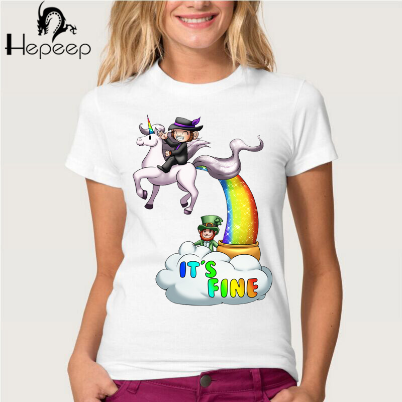 Hepeep brand+Personalized creative Design Vomiting rainbow unicorn print T-shirt women's short sleeve cute tops Ladies tee shirt