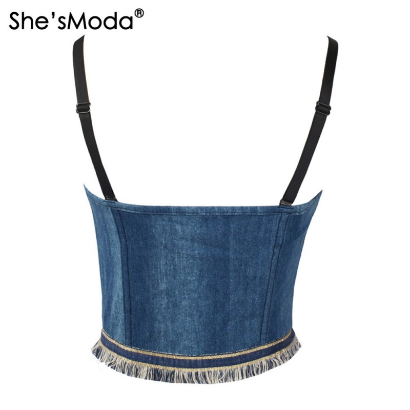Jean Denim Tassels Zipper Push Up Bustier Women's Bralette Cropped Top Vest Plus Size